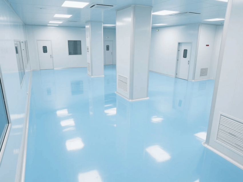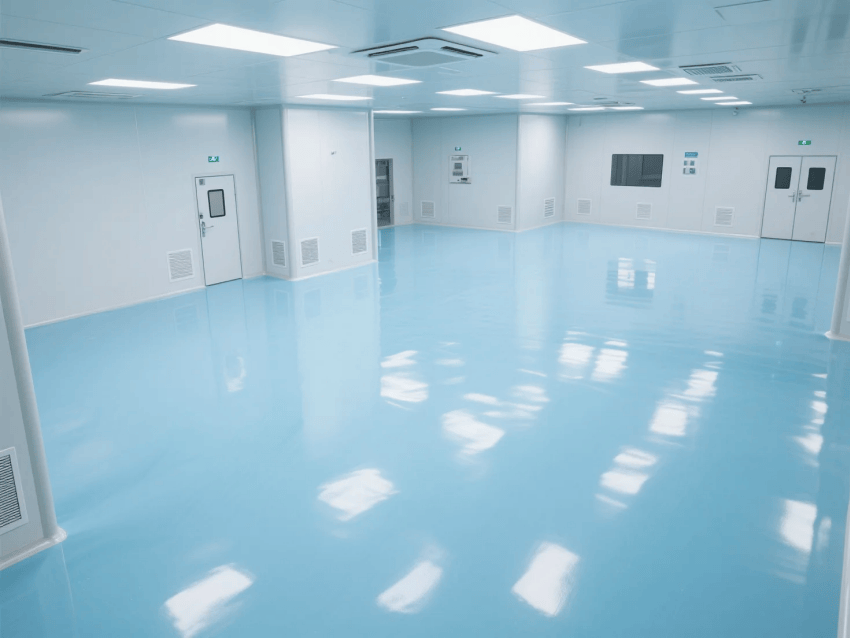 地面系統(tǒng)采用3mm厚環(huán)氧防靜電自流平地坪,表面電阻穩(wěn)定在10^6-10^9Ω范圍,耐磨系數(shù)達(dá)0.6以上,滿足電子元器件生產(chǎn)的防靜電要求。吊頂系統(tǒng)配置FFU+HEPA過濾單元組合,換氣次數(shù)≥25次/小時,維持穩(wěn)定的單向流氣流組織。功能區(qū)域通過淺藍(lán)色環(huán)氧樹脂劃線區(qū)分,設(shè)備基座采用啞光白不銹鋼包邊,既確保密封性又強(qiáng)化視覺引導(dǎo)。