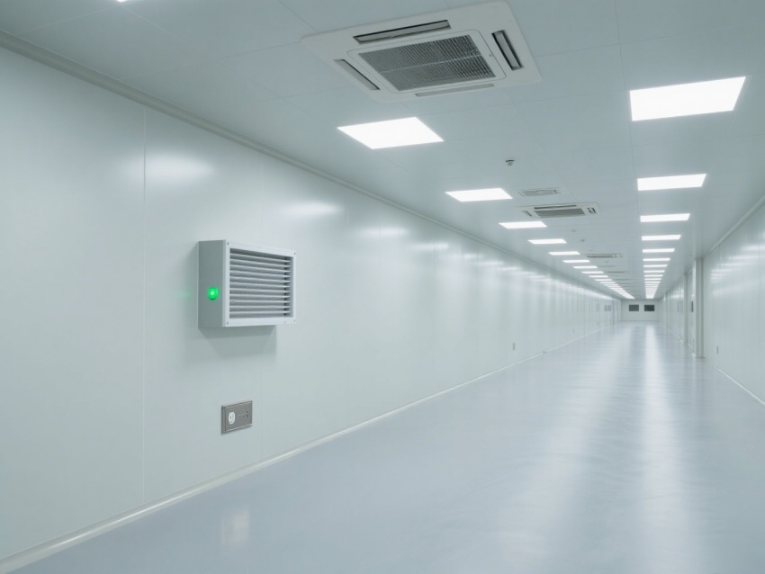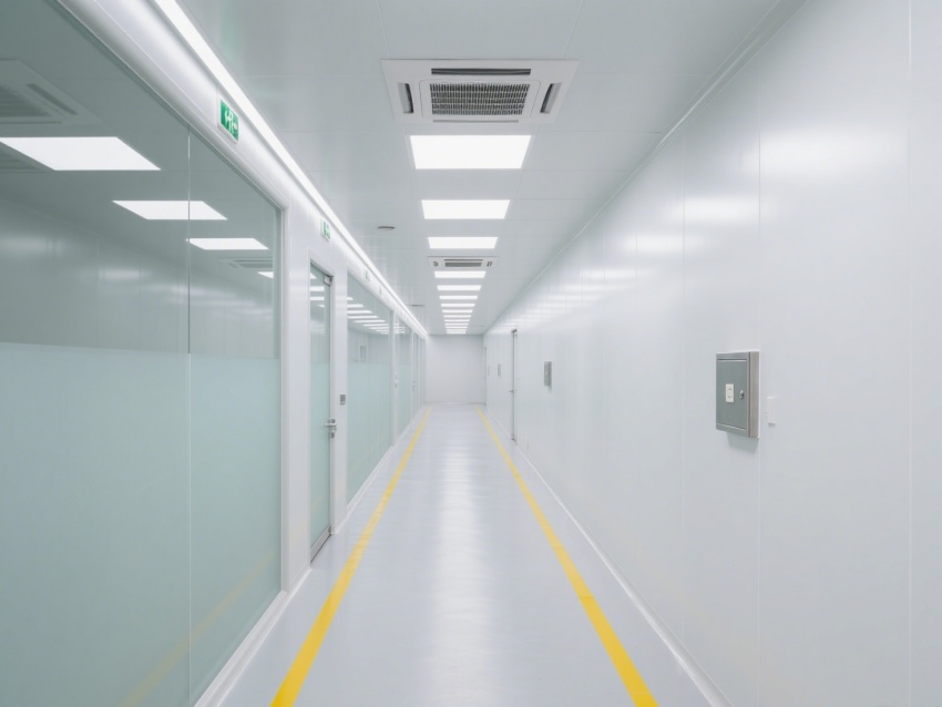 精準(zhǔn)還原電子行業(yè)潔凈空間,白灰主色調(diào)貫穿整體,風(fēng)格簡約專業(yè)且質(zhì)感統(tǒng)一。淺白墻面搭配淺灰地面、金屬色設(shè)備接口線條,既符合電子車間低塵、抗靜電的核心需求,又通過色調(diào)層次避免空間單調(diào),視覺上凸顯潔凈通透的特質(zhì)。?