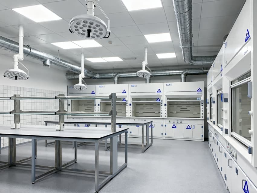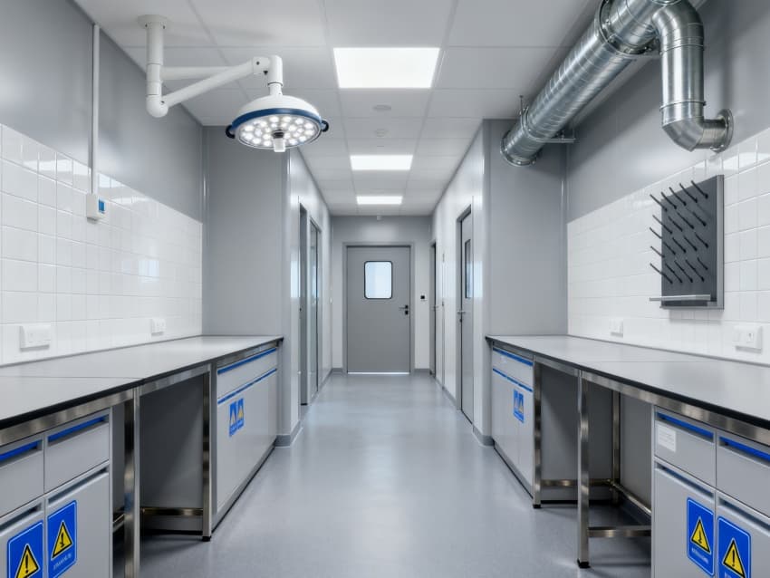 本生化研究實(shí)驗(yàn)室凈化工程嚴(yán)格遵循ISO7級(jí)潔凈標(biāo)準(zhǔn),將實(shí)驗(yàn)空間科學(xué)劃分為四大核心功能區(qū)域:樣品前處理區(qū)配備通風(fēng)櫥、震蕩儀等預(yù)處理設(shè)備,采用負(fù)壓設(shè)計(jì)防止交叉污染;試劑配制區(qū)設(shè)有獨(dú)立的天平室與超純水系統(tǒng),通過(guò)溫濕度智能調(diào)控系統(tǒng)將環(huán)境參數(shù)穩(wěn)定控制在±1℃與45%-60%RH;精密檢測(cè)區(qū)配置防震臺(tái)與電磁屏蔽裝置,可滿足高效液相色譜、質(zhì)譜儀等精密儀器的運(yùn)行需求;無(wú)菌操作區(qū)配備層流凈化工作臺(tái)與生物安全柜,配合動(dòng)態(tài)浮游菌監(jiān)測(cè)系統(tǒng),確保實(shí)驗(yàn)環(huán)境達(dá)到百級(jí)潔凈度標(biāo)準(zhǔn)。各功能區(qū)通過(guò)氣密式緩沖間與機(jī)械互鎖傳遞窗形成物理隔離,構(gòu)建起三級(jí)防護(hù)屏障。在保障蛋白質(zhì)分離純化、核酸提取擴(kuò)增等常規(guī)實(shí)驗(yàn)高效開(kāi)展的同時(shí),還專門(mén)設(shè)計(jì)了酶活性檢測(cè)專用恒溫恒濕實(shí)驗(yàn)室,采用獨(dú)立的凈化空調(diào)系統(tǒng)與UPS不間斷電源,可支持對(duì)環(huán)境參數(shù)高度敏感的高精度研究項(xiàng)目。此外,工程特別設(shè)置雙通道應(yīng)急處理系統(tǒng),包含緊急洗眼裝置、消防噴淋系統(tǒng)與防化物資儲(chǔ)備間,配合逃生路線熒光標(biāo)識(shí)與應(yīng)急照明系統(tǒng),全方位保障實(shí)驗(yàn)人員安全與科研數(shù)據(jù)完整。?