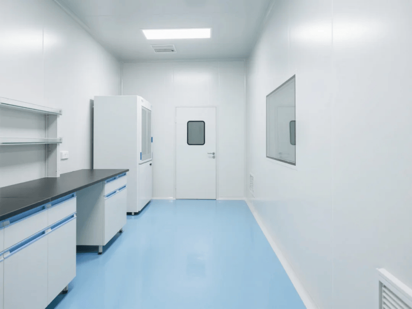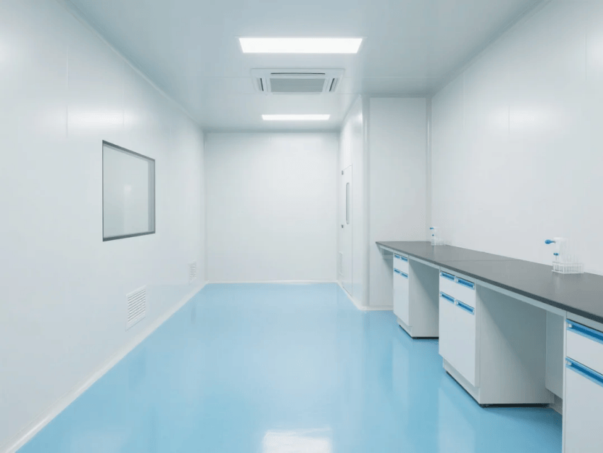 本方案采用生物科技極簡風(fēng)格,嚴(yán)格遵循ISO14644-1Class6潔凈標(biāo)準(zhǔn)。空間以純白抗菌彩鋼板墻體與淺藍(lán)環(huán)氧樹脂地坪構(gòu)建主體框架,營造純凈、高效的檢測環(huán)境。墻體采用50mm厚醫(yī)療級抗菌彩鋼板,所有接縫處采用R30mm圓弧處理工藝,確保無衛(wèi)生死角。淺藍(lán)環(huán)氧地坪添加防滑顆粒,摩擦系數(shù)≥0.6,同時具備優(yōu)異的耐化性。