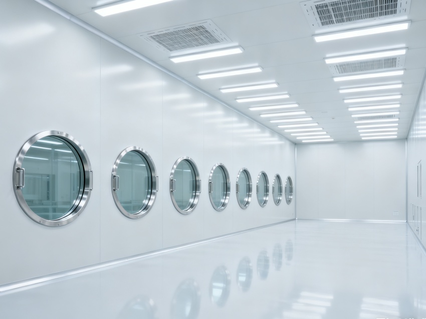 車間潔凈度嚴格遵循萬級標準(ISO8級),每立方米空氣中≥0.5μm的微粒數不超過352000個,通過初、中、高效三級空氣過濾系統實現空氣循環凈化,配合地面環氧樹脂無縫涂層、墻面不銹鋼潔凈板及圓弧角設計,減少灰塵積聚與死角。車間內溫濕度精準控制在23±2℃、45±5%RH,壓力梯度維持正壓狀態,有效阻隔外部污染物侵入,為芯片生產提供穩定、潔凈的環境,保障芯片良率與性能。