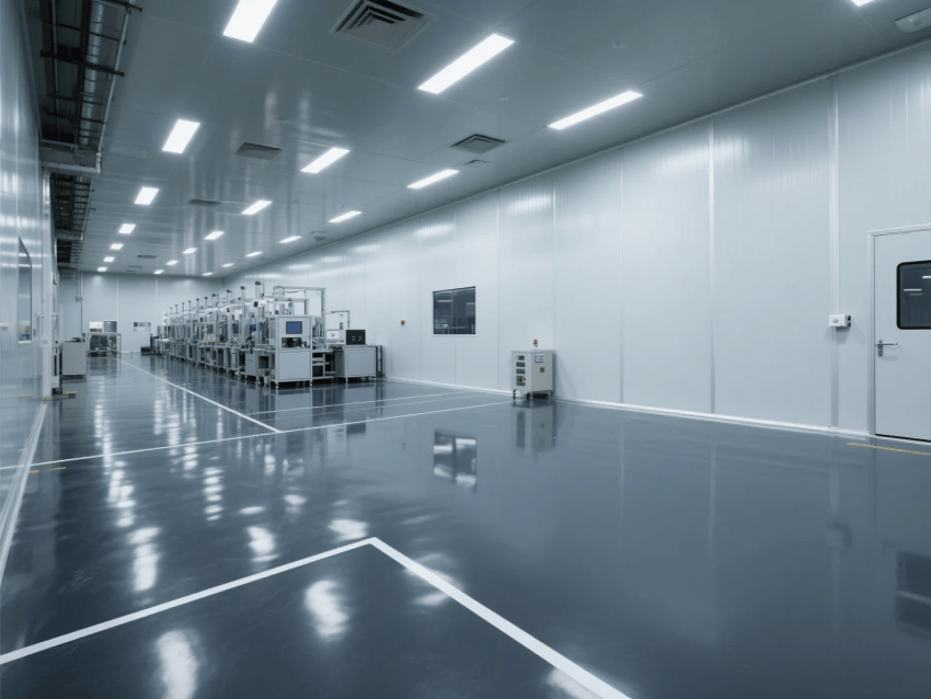 本工程嚴(yán)格遵循ISO14644-1Class6標(biāo)準(zhǔn),專(zhuān)為高精度激光器件鍍膜工藝打造專(zhuān)業(yè)潔凈生產(chǎn)環(huán)境。整體采用啞白彩鋼板墻體與深灰防靜電環(huán)氧地坪的極簡(jiǎn)工業(yè)配色,營(yíng)造精準(zhǔn)