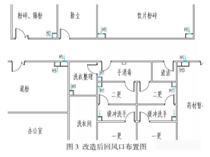 在使用中問(wèn)題就來(lái)了,低壓力級(jí)別房間潔凈度不達(dá)標(biāo),只能開大送風(fēng)口閥門。后來(lái),要么房間受污染空氣漏至外潔凈走廊,污染整個(gè)區(qū)域,要么潔凈走廊風(fēng)吹進(jìn)這些低壓力房間,導(dǎo)致其無(wú)法回風(fēng),房間新風(fēng)量嚴(yán)重不足,嚴(yán)重影響使用,使用方只能關(guān)閉潔凈空調(diào)進(jìn)行生產(chǎn)。這樣,運(yùn)行不到一年就進(jìn)行改造設(shè)計(jì)。