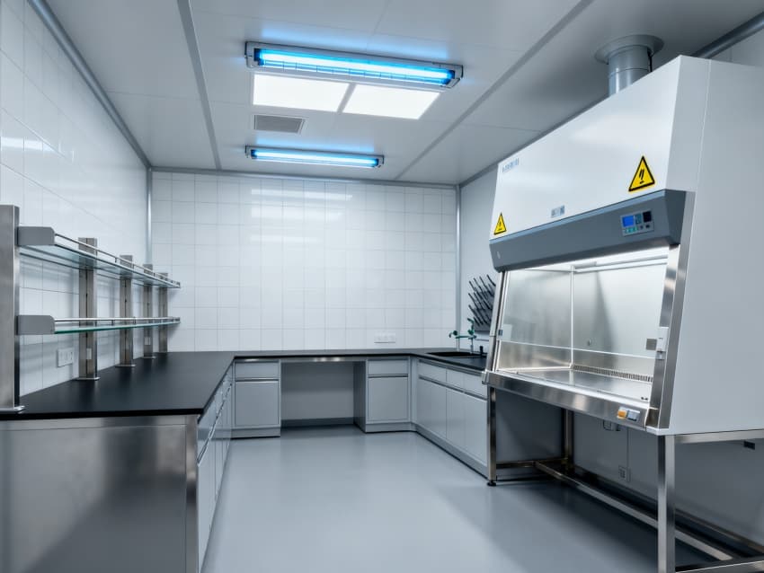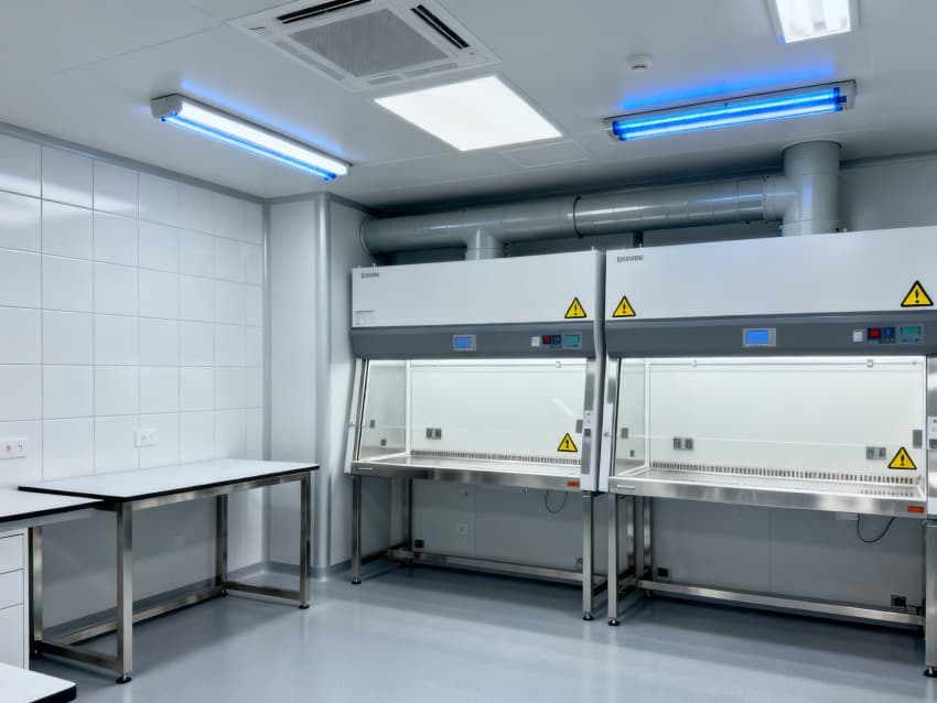 圍護結構選用304不銹鋼抗菌墻板與無縫PVC地面,轉角圓弧處理無衛生死角,配套紫外消毒系統與恒溫恒濕控制(22±1℃,50±5%RH),全面滿足微生物研究的無菌環境要求。